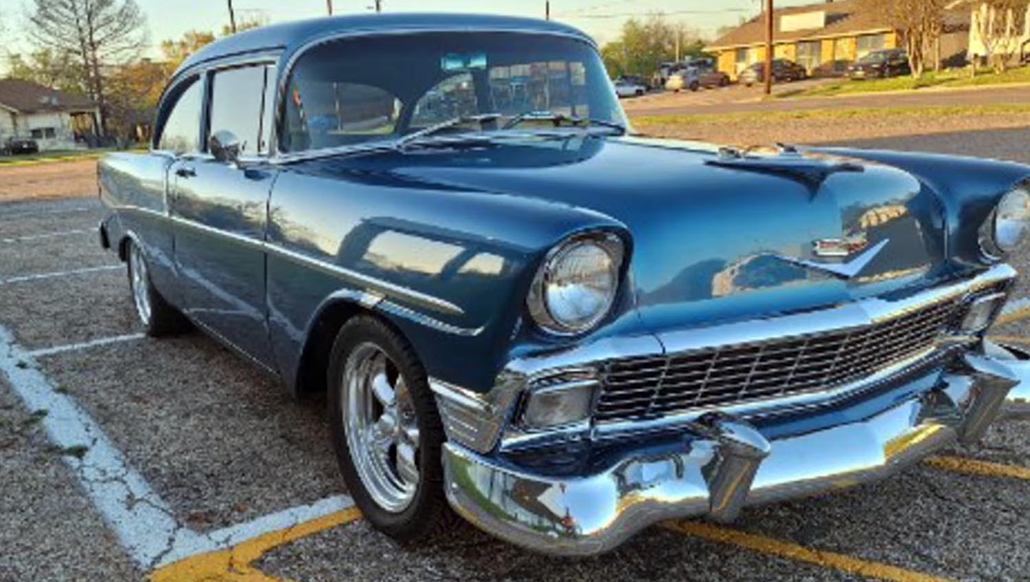 This 1956 Chevrolet 210 restomod features a V8 engine equipped with dual 4-barrel carburetors and a chrome intake. Crossing the block at Houston 2026, it offers modern air conditioning, custom bucket seats, and power front disc brakes for a refined driving experience.