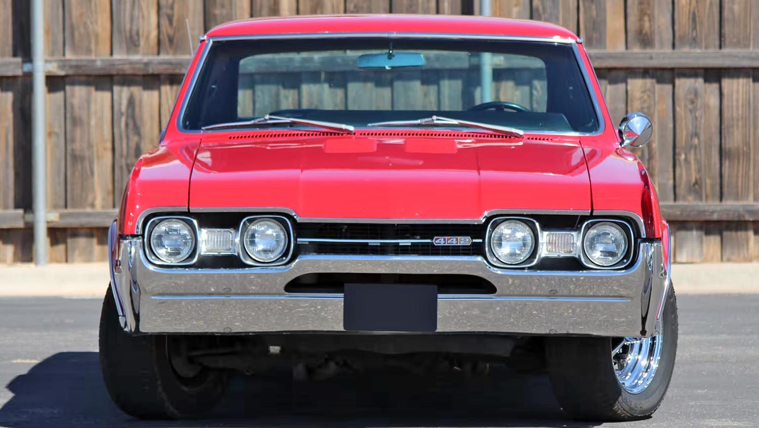 This 1967 Oldsmobile 442 features a 400 CI V-8 engine, Flame Red exterior, and factory air conditioning, offering a perfect blend of power and comfort for collectors.